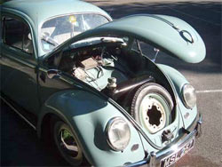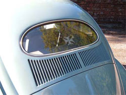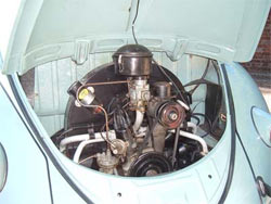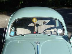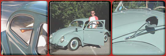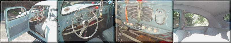The engine is the original 1198cc, 30bhp flat four. After 79,500 kilometres it’s still never been rebuilt & runs beautifully. The front end has been lowered with an adjustable front beam axle for that all important cool stance & a fresh coat of Horizon Blue was applied by “MoonFace” paint shop in March 2001, but otherwise the car is virtually as it left the factory, right down to the flip up “flag” indicators. The stylish Albert swan neck mirrors are American reproductions, but the genuine valve radio is a 1950s Phillips’ original -you can hear the valves buzzing as they warm up! The seats are all original too while the carpets were made by Newton & Commercial to the period VW pattern. Marc plans to replace the door panels at some point as the appropriate material is still being produced in Berlin. A recent addition since these photos were taken is a genuine period mesh external sun visor, imported specially from Australia.