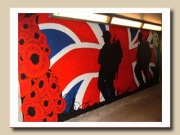 Discovered this in a subway beneath a roundabout on the Basingstoke ring road, a few hundred yards from my flat. I don't know anything about it, but imagine it's the result of a joint project between the local Council & the nearby Tech College. The flowers & rememberance piece in particular are beautifully done, free-hand using aerosol cans. They've got nothing to do with bikes or cars but I just thought they deserved to be seen. Shame they're in a tunnel -wouldn't they make a great backdrop for a photo-shoot. There are four different underpasses on this particular roundabout & each one appears to have been painted by a different artist. The ticket machine & running businessman refer to the train station to which that tunnel leads. This seems to be a bit of a trend in Basingstoke with several other subways decorated in a similar manner. Nice to see some of that youthful talent being put to good use! |