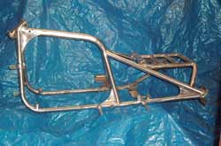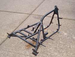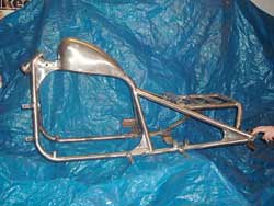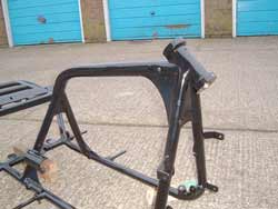tubes welded into the top tube to mount the tank to & 4 vertical ones set into the corners of the rack to take the locating pins of the removable pillion pad. We had a pair of aluminium yokes machined up as well, but only because I knew a man who could at an affordable price, otherwise we’d have used standard factory ones. No special jigs or patterns. Just a plumb-bob, spirit level, engineer’s square & steel rule. And lots & lots of measuring, checking & checking again! Everything was temporarily tack-welded in place & wasn’t fully seam-welded until we were absolutely sure it was right. Having said that though, we weren’t working to any sort of plan or drawing. Just ideas in my head. |