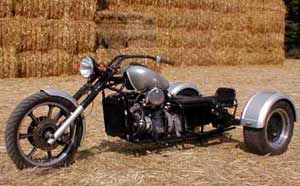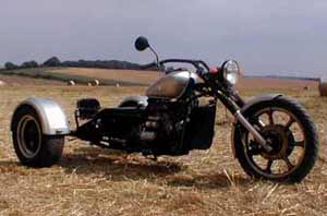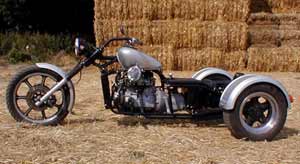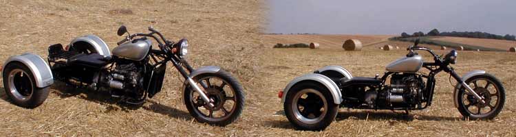 My older, far more talented, brother Steve is now heavily immersed in the drag racing scene, but has had a few forays into the murky world of trike building as well. This is a very tidy little Reliant he put together a couple of years ago. Although similar to mine & borrowing a few design ideas, it’s got a more radical look with the front down tubes following the line of the Mini radiator, a stretched or “goose-necked” headstock with plenty of tubular bracing, & a narrow hard-tailed back end. The forks & front wheel are Kawasaki, probably GT750LTD, the tank is Suzuki Savage & the headlight looks like a Superdream item. Being annoyingly clever, Steve created his own moulds & produced the fibreglass rear guards to mimic the lines of the kwacka front one. Rear wheels are Revolution 5 spokes that previously graced a Ford Capri & the frame & bars are constructed from the same 1 3/8” O.D tubing I use. This was a budget machine but managed to outclass many far more expensive “pro built” trikes. Must’ve been well engineered cos I last saw it several years later at the 2004 Magna Carta show in Hertfordshire. Steve’s idly talked of building a seriously radical Reliant show trike with some very trick engineering details. Hope it happens one day.
