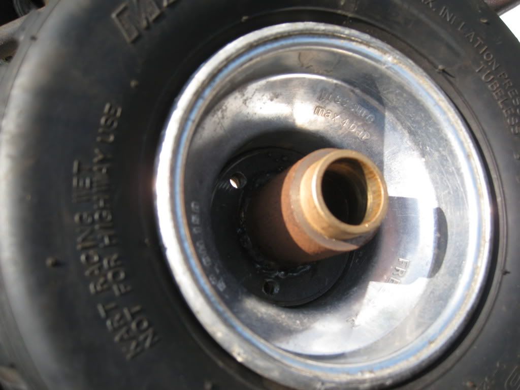 I use one wheel drive to the rear axle,this is the freewheeling hub.It creates a 'diff' effect and is easier to steer than a kart axle.Its basically a piece of tube welded to the hub plate.The tube is larger diam than the axle to accomodate a bush at each end of the tube. I
