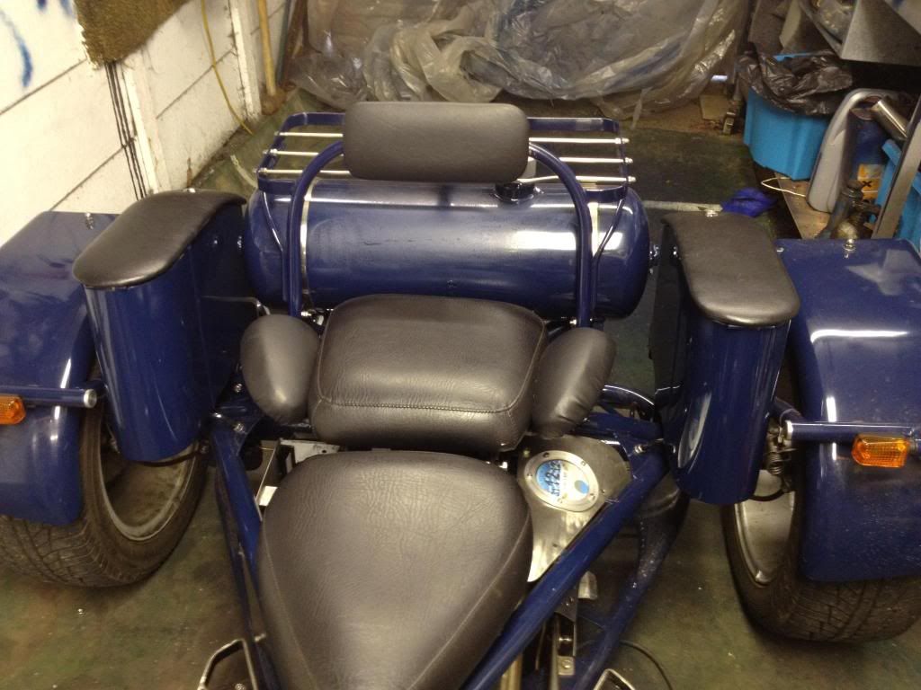 The trike rode well to Trikefest and back,no major probs. Cos Im running in the engine,kept to a steady 40/45 mph and a couple of blasts up to 50mph. The main problem arising from the journey (apart from the appalingly bumpy road between Mildenhall and Littleport! Grin)was the rear seat space( depth). I found myself moving too far forward on the front seat to accomodate, as we went over bumps SWMBO tended to move/slip forward on the seat . I think it needs some work. So Ive removed the rear seat , tank and rack,and re mounted the tank about 3" further to the rear. The seat and rack will all move the same amount backward,this should give more room to the rear passenger,and I'll also tilt the seat squab a bit lower at the rear.  Im also going to build 2 small arm rests either side ,and make them height adjustable. The wider gap between the front/rear seats will accomodate a upside down 'U' shape for a front seat backrest/come grab rail for the passenger,with a built in storage area. Im going to make this adjustable to be able to tilt it slightly back and forth to get the best position for me ,as well as the pillion passenger.