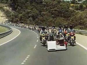 The local biking community became extras for many of the mass fight scenes & over 400 of them turned out for the now famous highway funeral procession, with a coffin being carried at the head of the cortège aboard a racing sidecar outfit.