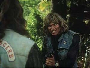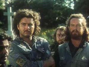 Filmed in 1974, Stone was co-written, produced & directed by Sandy Harbutt, who also co-starred as club leader The Undertaker. This was his only film, but was an instant hit & is widely seen as a classic of it’s genre. The hippyish language & over-acted violence may seem dated now, but otherwise, Stone has survived the past 35 years or so remarkably well. In fact the plotline’s been borrowed for several subsequent Hollywood blockbusters. Ken Shorter, who plays Stone, was a real life ex cop & the rival gang, The Black Hawks, were played by a genuine Australian bike club. In a peculiar case of life imitating art, the fictional Grave Diggers’ club patch –a skull wearing an Australian Army slouch hat, was later adopted by the Australian Vietnam Vets Motorcycle Club.