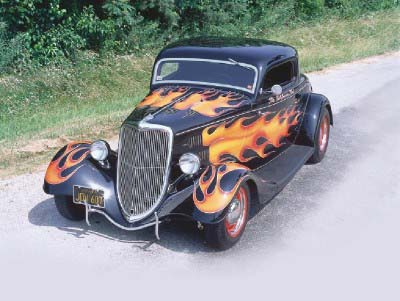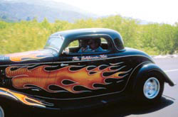 5 years on & Mike McCord rumbles into town in his beautiful chopped ’34 Ford coupe, glossy black & flamed. It’s an iconic car, but personally I found the sheriff’s long, low menacing purple & white ’57 Plymouth 2 door cop car, with it’s nudge bars & high tail fins, far cooler. The black Ford actually belonged to Jake Jacobs, one half of the legendary Pete & Jake’s HotRod Parts business. They opened the shop the year the film was made & were catapaulted to fame when the producer, Howie Horowitz, who also made the classic 60s Batman TV series, chose the car as the star of his new project. It ran a 302 cubic inch Ford motor & quick-change gearbox with a 4 barrel Holley, though in one scene it appears to have 8 single carbs.5