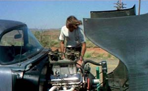 allow fitment of the racing slicks carried in the boot & tunnel rams over the dual Holley carbs poking up through the bonnet. The interiors were stripped with the rear seats removed & two bucket seats up front. Richard Ruth supplied the cars in baby blue paintwork but this was replaced with simple grey primer to fit the no-nonsense racing image. Incidentally, Ruth had a walk-on part in the film, appearing as a garage mechanic, strolling out to admire the car as Taylor & Wilson stop for petrol.