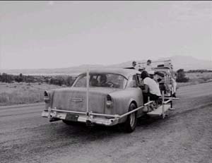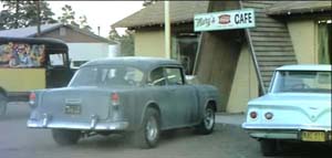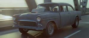 3 identical ’55 Chevy 150 sedans were commissioned from Richard Ruth of Competition Engineering in Sunland, California. General Motors supplied 2 454ci Chevy big block engines, which were used in the cars used for exterior & interior shots, & a 2 year old L-88 427 motor for the stunt car. The 2 main vehicles were fitted with fibreglass flip fronts, boot lids & doors, with sliding plexi-glass windows, while the stunt car was all steel & had a full roll cage & a special dual braking system, allowing either the left or right wheels to be locked for intentional skids. This set-up was never used in the film though. The storyline called for the stunt car to be rolled while avoiding a road accident but in the end it was simply driven off the road into a field. All the Chevys featured distinctive large radiused rear wheel arches to