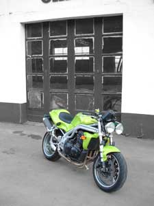 I’d originally planned to keep it just till the trike was road worthy again but to be honest I’d be sorry to let Kermy go now. I’ve always had one-off, custom machines, but this is one of the very few bikes I don’t feel the need to mess with. The previous owner fitted the flat bars & I’ve added a small but well positioned bar-end mirror, but other than that, it’s just as it left the factory. Personally I reckon it’s the shapeliest of the Speed Triple versions, including the new ‘05 model, & I wouldn’t want it in any other colour than Roulette Green!