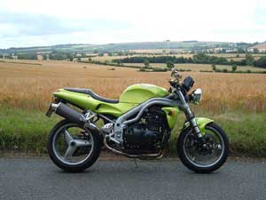 Haring up a long straight, working it up through the 6 gears, then dropping it back down & pulling it over low into a long sweeping bend before rolling on the throttle again never fails to put a grin on my face. I’m not a natural boy racer but I do like this! It’s affectionately known as Kermit the Thug, cos it’s big & green & scary! This is a 2000 model 955i Triumph Speed Triple. 1000cc, water cooled, fuel injected, 3 cylinders. Built in the Hinckley factory based on an old Kawasaki engine design, it’ll do 148mph according to the manual -but not with me on board! It’ll certainly out perform me. I’ve taken it to 120 or so, but beyond that my reactions just aren’t quick enough & besides, without the benefit of a fairing, fighting against the wind pressure becomes too uncomfortable to bear for long. |