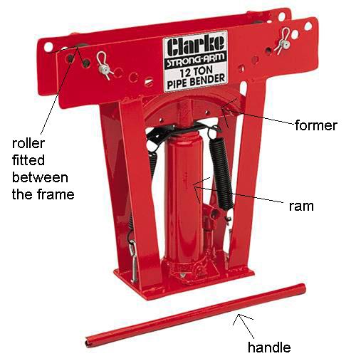 Your former, chosen to suit the pipe size, sits on the head of the ram, the two rollers at the top of the frame are then adjusted to determine the radius of bend. Your pipe is slotted under the rollers and into the former and the bend is achieved by pumping on the handle.