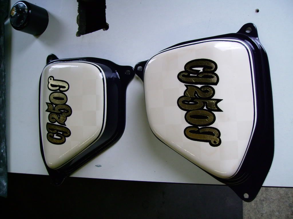 Also finished the front wheel, started the paint on the front forks (the superdream ones), the side panels, and found a seat unit for it!!